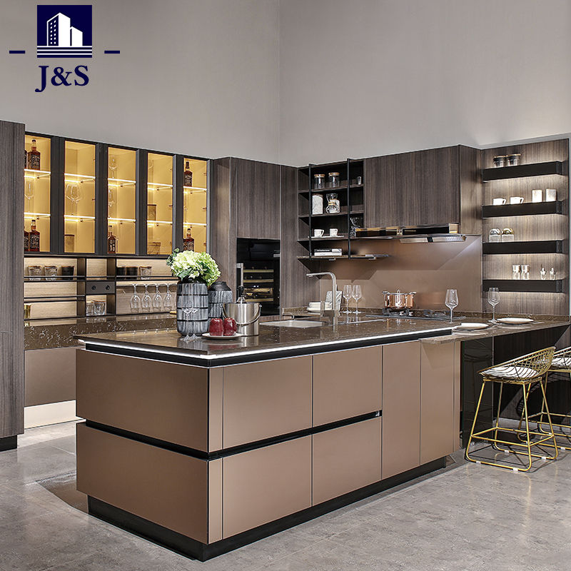Dodávka J&S Mateiral Mateiral Out Door Kitchens Built In Kitchen Designs. Kovový dizajn kuchyne v laku šampanského, horná kuchyňa zo skleneného dreva v špičkovom laku.
