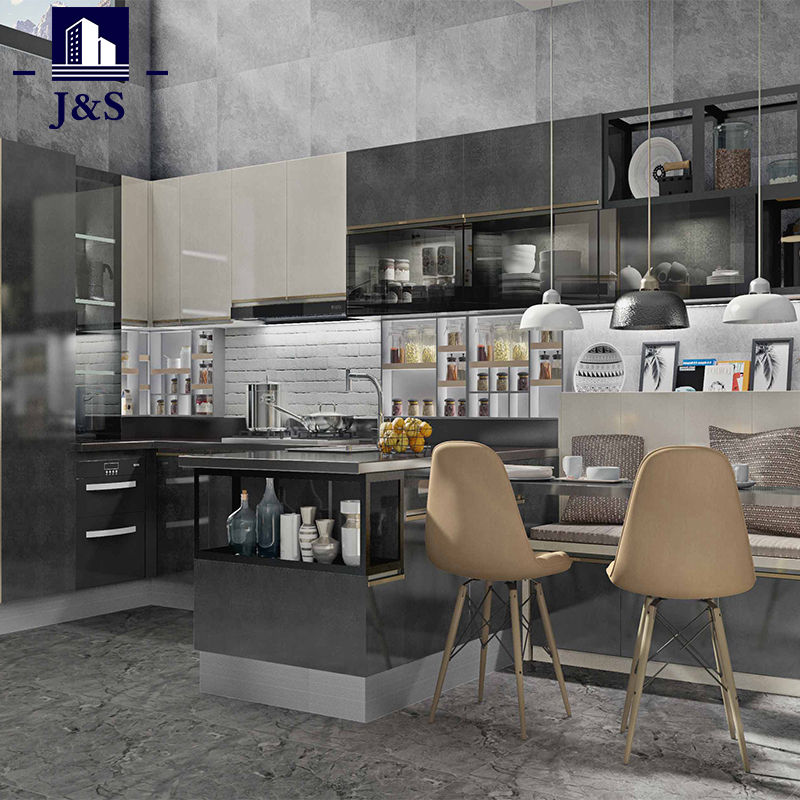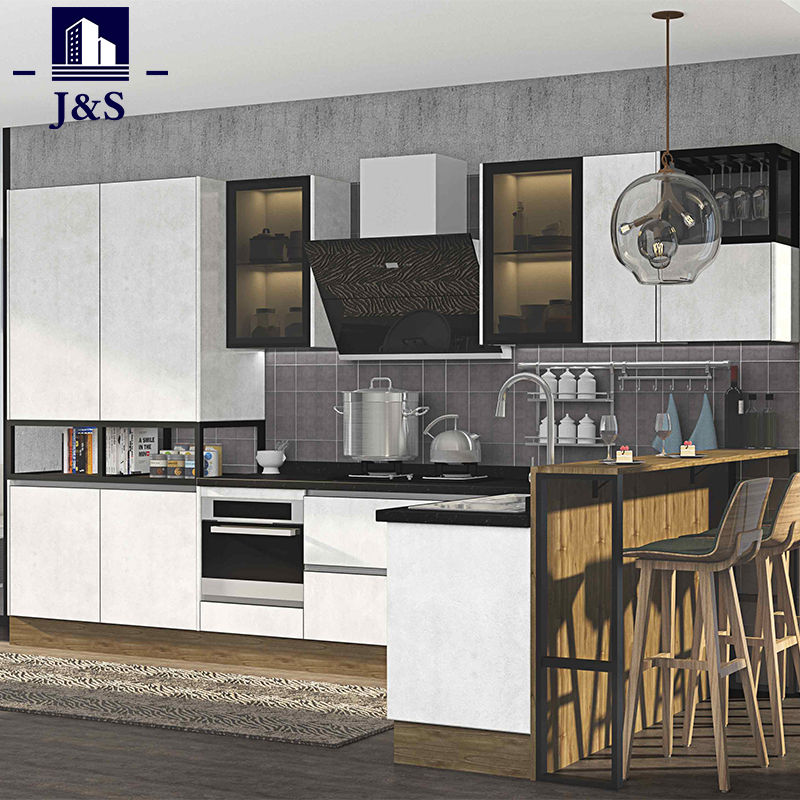 Dodávka J&S Promotion Luxusné vidiecke kuchynské dizajny za najlepšiu cenu. Kuchynské dvierka v betónovej farbe PET, odolná doska lavice z nehrdzavejúcej ocele.