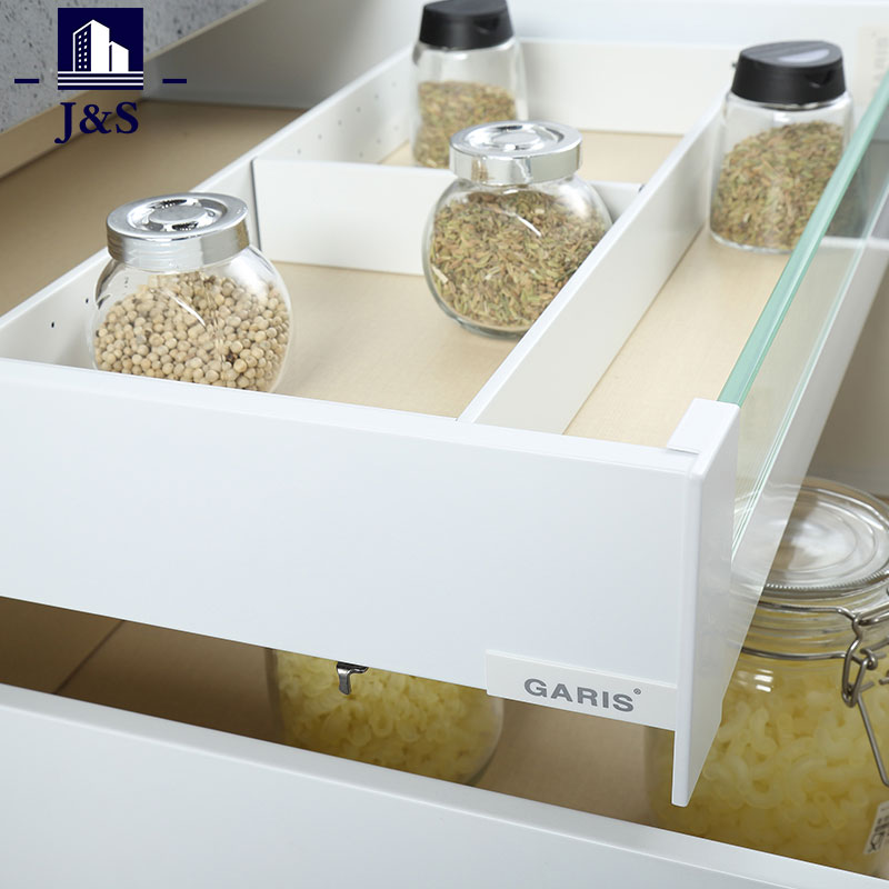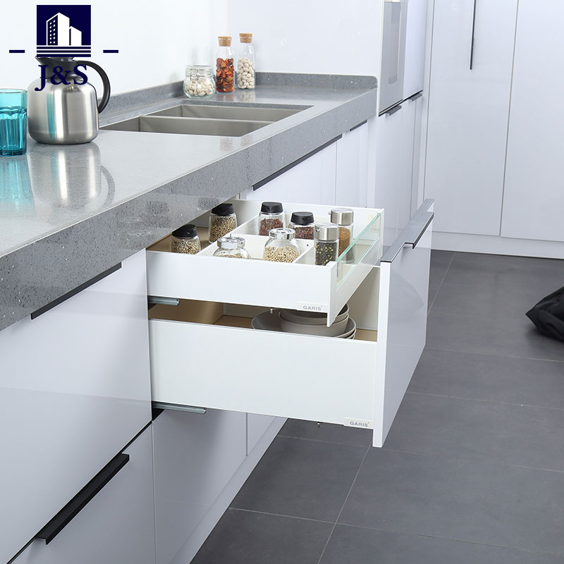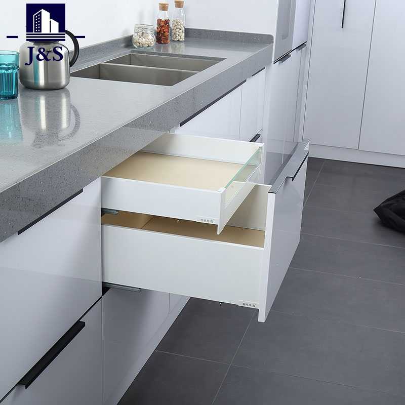 Biela tenká zásuvková skrinka je obľúbená po celom svete. Tandemová skrinka Push to open runner v kuchynskej skrinke je trojvrstvová oceľová bočnica so zabudovaným tlmením, známa aj ako luxusné tlmenie. Je to najlepší hardvérový doplnok používaný v celej kuchyni, šatníku, zásuvke atď., je pevnejší a odolnejší ako trojdielna vodiaca lišta.